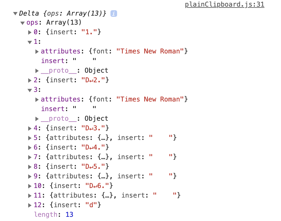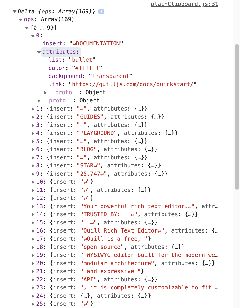 我全选并复制一下Quill官网首页的内容,输出的Delta如下图所示: