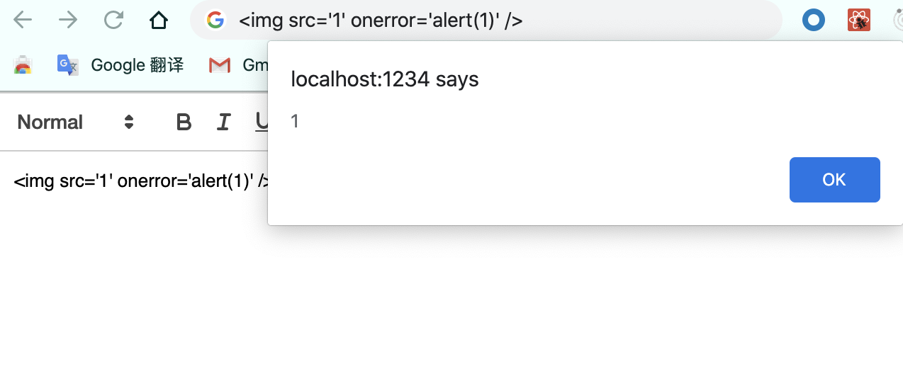 虽然编辑器已经帮我们做了转义操作,但是clipboard.convert方法却有漏洞,当我们将纯文本格式的<img src='1' onerror='alert(1)' />粘贴到编辑器后,convert方法会将文本字符串转换为img实例,从而就触发了onerror事件。