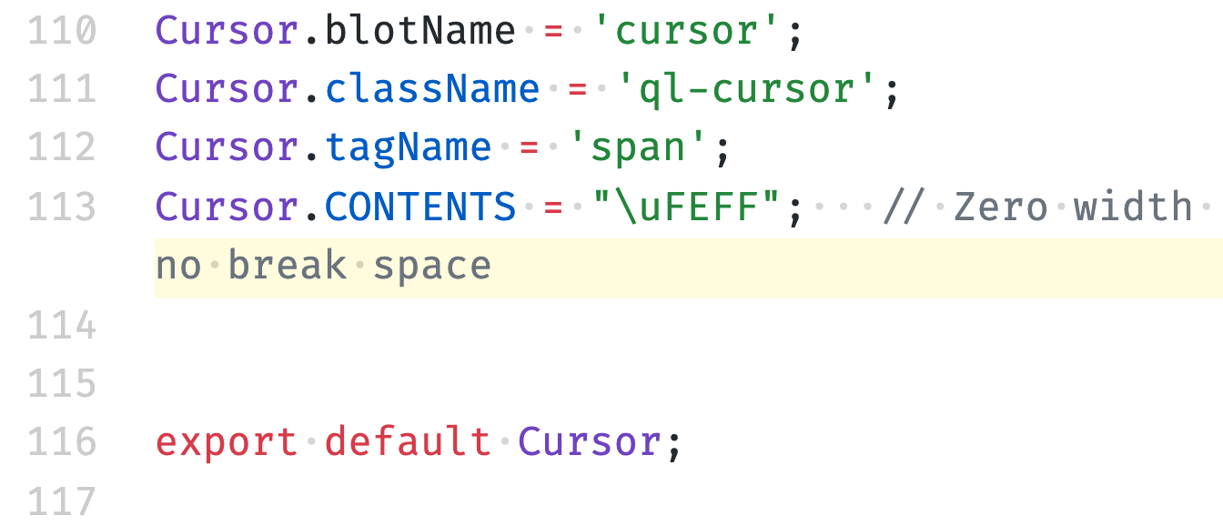 在用户编辑一篇已保存的文章,然后点击退出或返回时,为了更好的用户体验则需对编辑后的文章内容与之前保存的内容进行比对,从而判断是否要弹出二次弹窗让用户确认是否确认退出编辑页面。但是有时虽然在视觉上看着内容完全一致,并且比较方法写的也没任何问题,但是比较的方法一致返回内容不一致。这时就有可能是因为\uFEFF!该Unicode字符可以在quill/blots/cursor中找到,在源码的最后部分:
