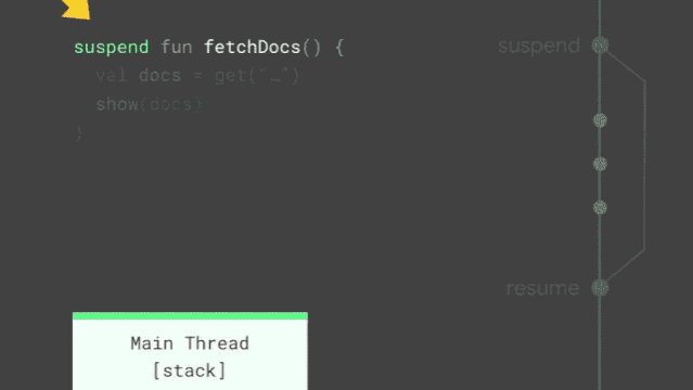 在上面的示例中,get 仍在主线程上运行,但它会在启动网络请求之前暂停协程。当网络请求完成时,get 会恢复已暂停的协程,而不是使用回调来通知主线程。