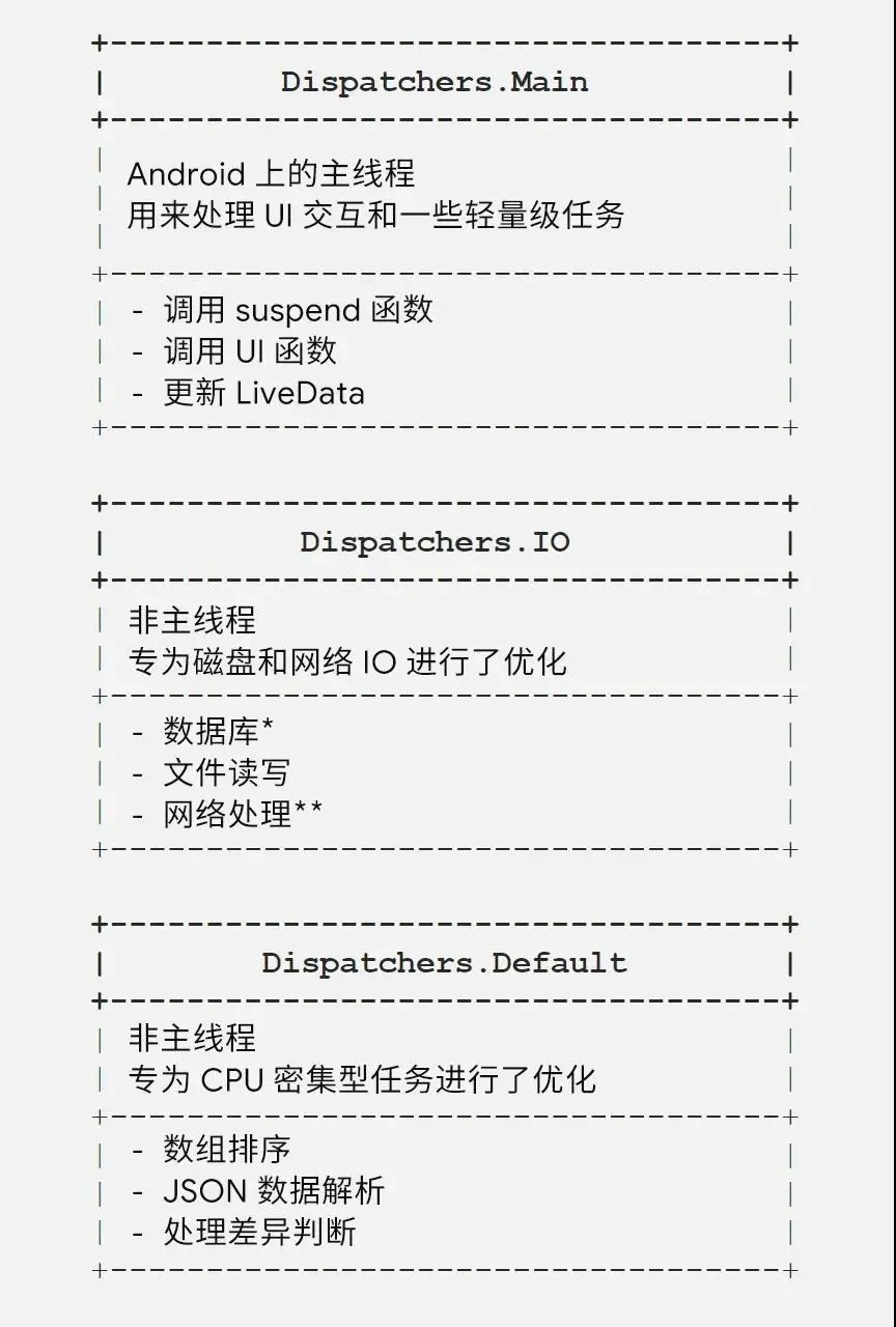 Kotlin 提供了三个调度器,您可以使用它们来指定应在何处运行协程: