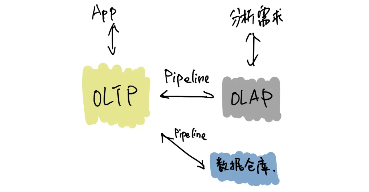 传统的数据架构通常将 OLTP、OLAP、离线数仓分离,各个系统各司其职,中间通过独立的 Pipeline 进行同步(有时候还会加上 ETL)。