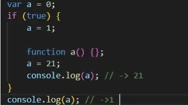 在{}内声明函数,会在{}这个块级作用域声明一个a的局部变量。