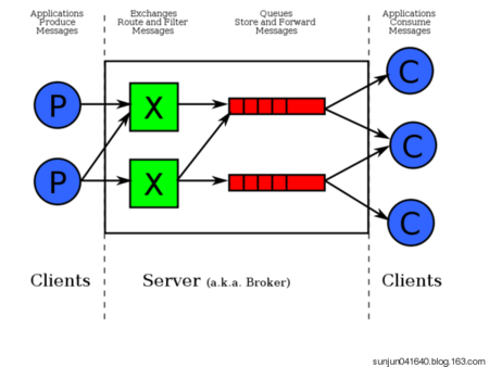 通常我们谈到队列服务, 会有三个概念: 发消息者、队列、收消息者,RabbitMQ 在这个基本概念之上, 多做了一层抽象, 在发消息者和 队列之间, 加入了交换器 (Exchange). 发消息者和队列没有直接联系, 发消息者把消息给交换器, 交换器根据调度策略再把消息再给队列。