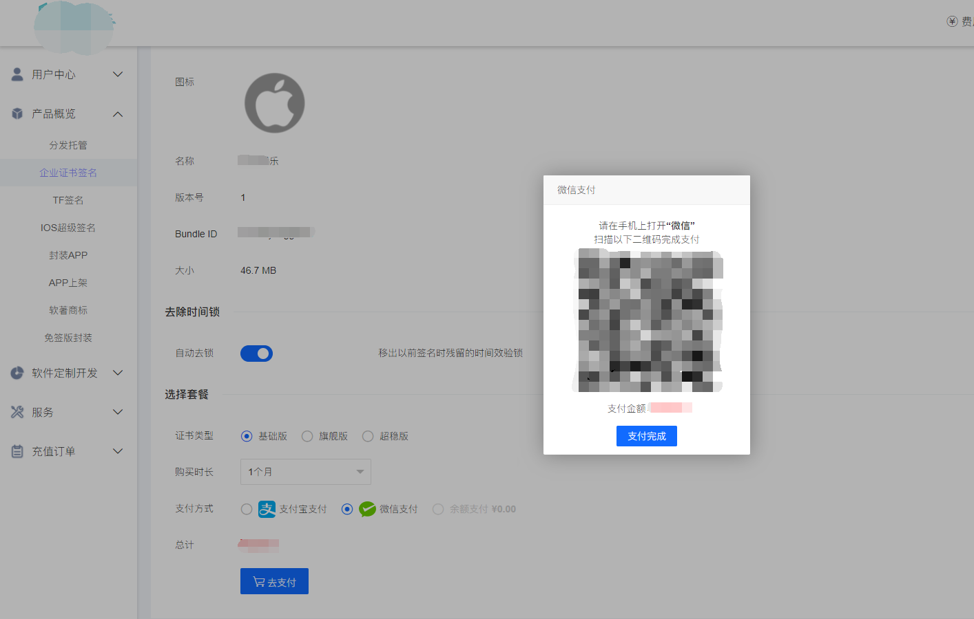 4、在在线签名页面上传IPA文件,然后选择对应的签名版本和时间,点击在线签名,弹出支付页面,选择微信或者支付宝支付即可。