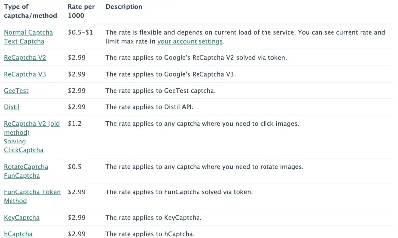 当然这种网站肯定是要收费的,按照 1000 次识别为单位,其花费的费用为 0.5 美刀到 2.99 美刀不等,比如非常简单的图形验证码可能就是 0.5 美刀,这种验证码对于其人力和算力资源消耗都是相对较小的,对于复杂的 reCAPTCHA 验证码,就要花 2.99 美刀了,因为识别这么一个验证码并不容易,其背后的人可能需要看好多图,点选好多次才能完成一次成功的验证。