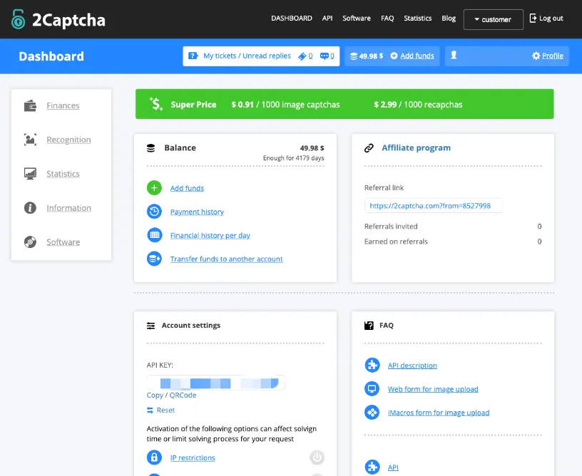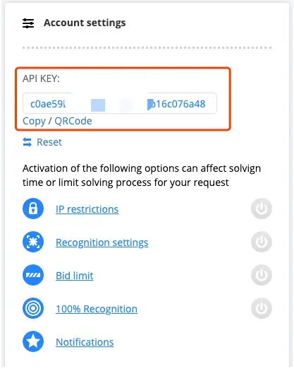 这里最重要的就是 API KEY 了,它是我们用来使用 2Captcha 的凭证,我们将它复制下来,后面我们会在代码中使用它。