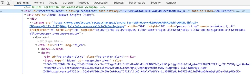 我们打开浏览器的开发者工具,查看其页面源码,首先找到 reCAPTCHA 的源代码,如下图所示:
