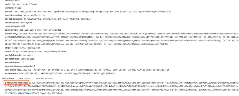 可以看到其就是提交了一个表单,其中有一个字段就是 g-recaptcha-response,它会发送到服务端进行校验,校验通过,那就成功了。