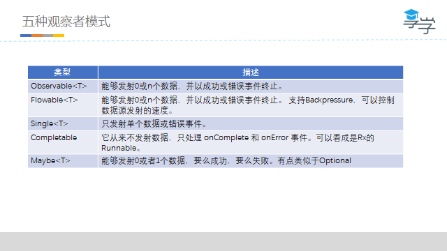 Observable什么时候开始发射数据序列?这取决于Observable的实现,一个”热”的Observable可能一创建完就开始发射数据,因此所有后续订阅它的观察者可能从序列中间的某个位置开始接受数据(有一些数据错过了)。一个”冷”的Observable会一直等待,直到有观察者订阅它才开始发射数据,因此这个观察者可以确保会收到整个数据序列。