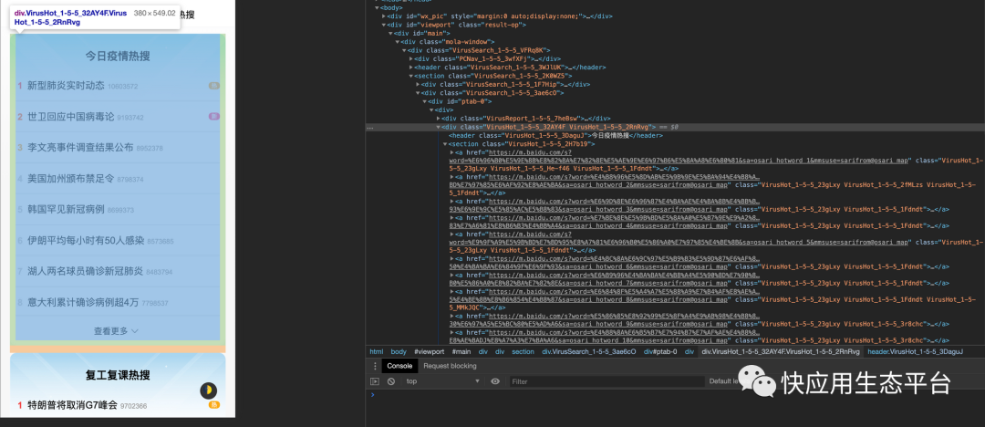 今年疫情的影响越来越大,已经成为一个世界性的问题,疫情的发展时刻牵动每个人的心,正好也是因为疫情,今年让作为加班狗的我突然重温“放寒假”的感觉。宅在家里太久就想搞点事情做,于是就萌发了搞个疫情热搜应用的念头。说干就干,经过两天构思,两天开发,踩了不少坑之后,一个疫情热搜快应用就诞生了。