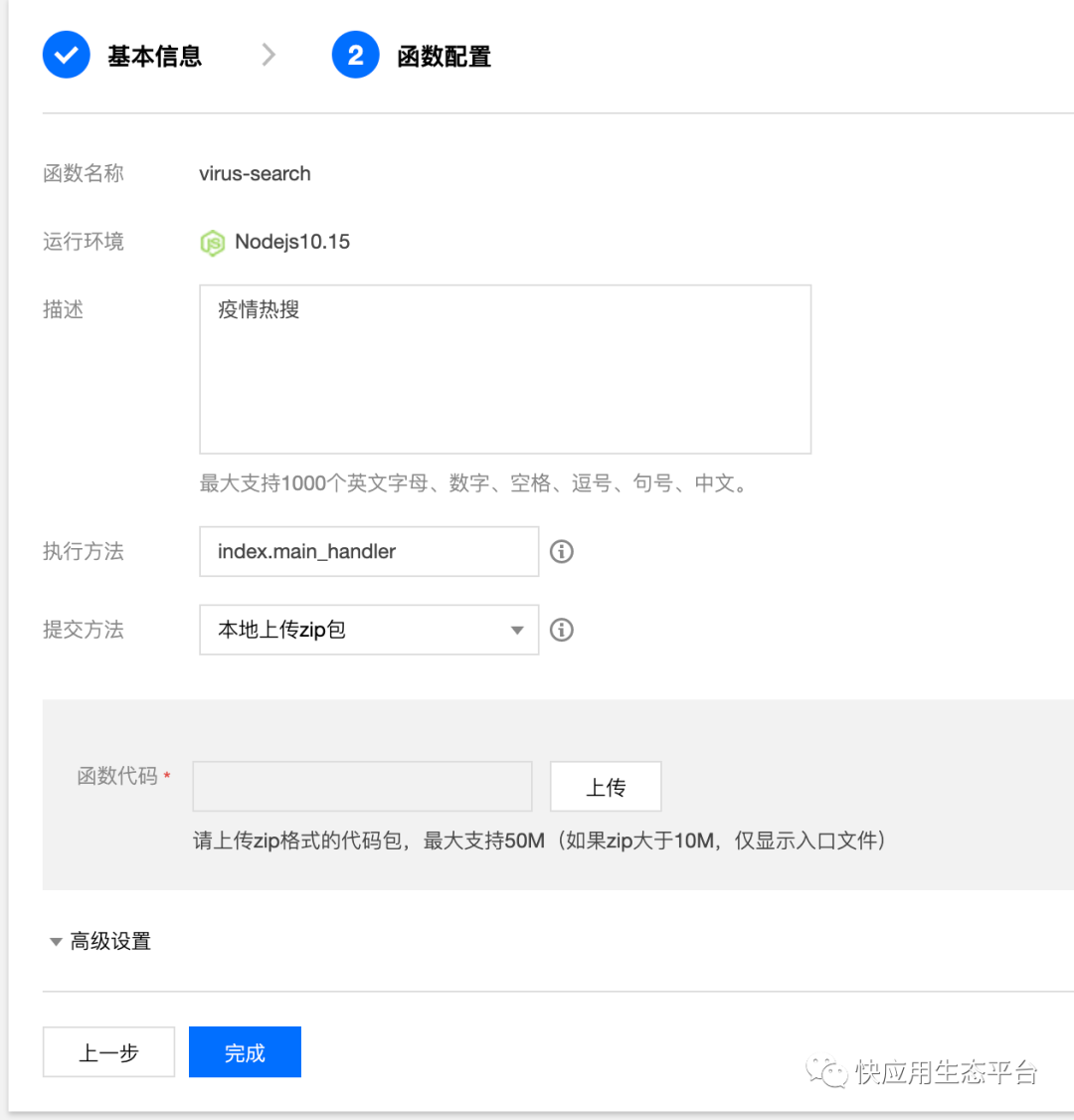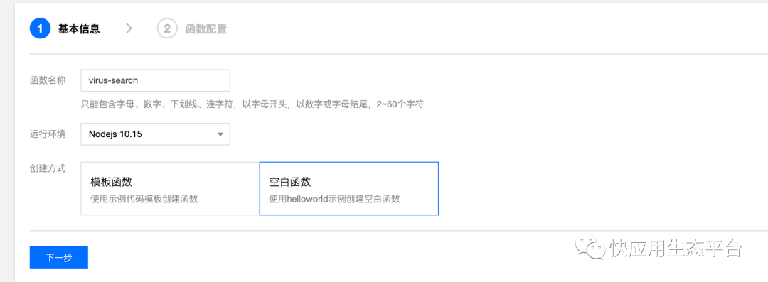 scf init -r nodejs8.9 --name virus-search # 初始化一个项目名为virus-search的项目,运行环境是nodejs8.9