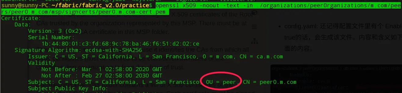 config.yaml: 还记得crypto-config.yaml配置文件里有个 EnableNodeOUs 吗?如果设置为true的话,会生成该文件。内容和含义如下图,如果看不懂,就接着看后面的内容。执行这个命令,可以查看证书内容: