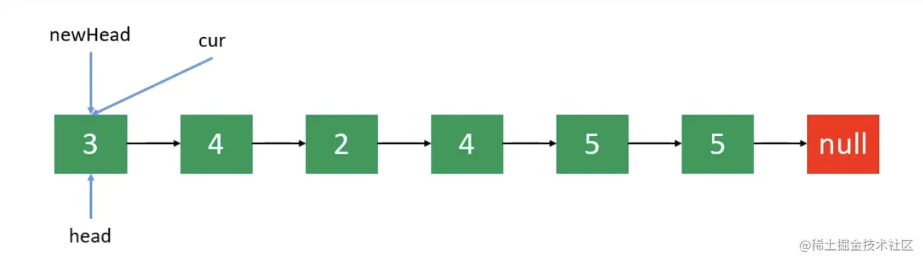 newHead一开始为nil,直到发现第一个不需要被删除的节点,并将newHead指向该节点(cur(newTail)也指向该节点)。 - 另一种做法可以新建一个链表,将