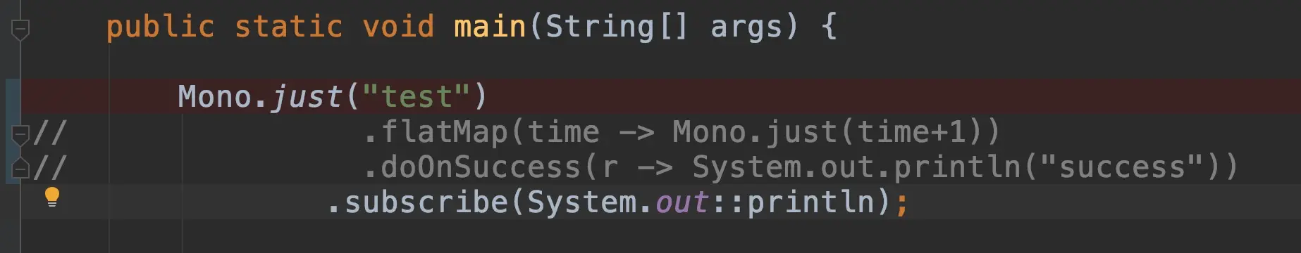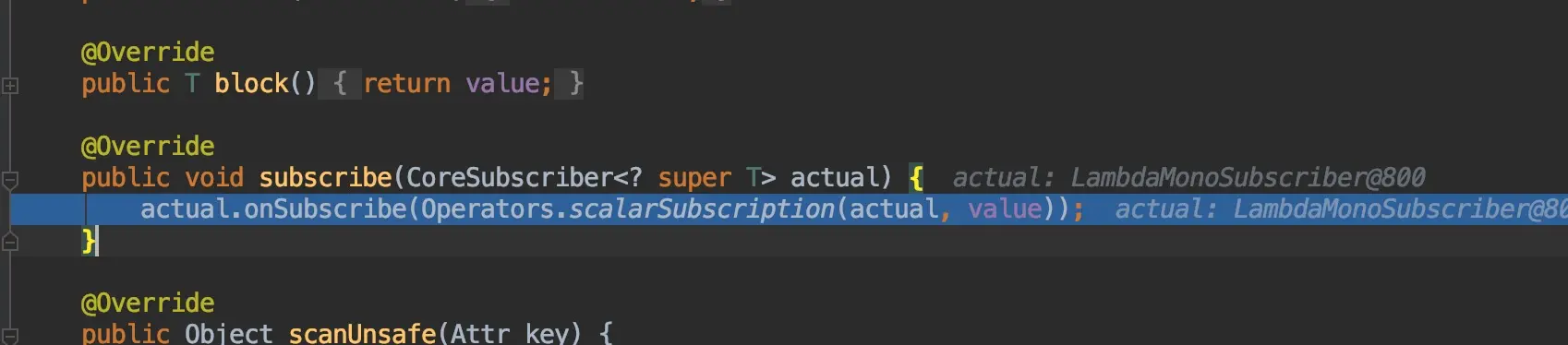 上面简单的测试用例中,当执行subscribe方法时候,才回去真实调用订阅者去订阅发布者的元素. 从Mono的subscribe方法中,可以看出这里默认是创建的是 LambdaMonoSubscriber订阅者,它其实是对于consumer等函数式接口的封装类,然后执行subscribe方法传入该订阅者. 如果publisher中间如果有优化的动作则会执行优化的操作,然后最后就是执行发布者的subscribe方法发起订阅. 接下来会执行调用MonoJust的subscribe方法,真实执行有actual这个订阅者执行onSubscribe方法,这里订阅者对象实际 是ScalarSubscription标量的订阅对象. 由Subscription对象调用request方法,向订阅者发送订阅元素请求元素个数的方法,默认是Long类型的最大值. 然后执行LambdaMonoSubscriber订阅者的onNext对元素进行订阅. LambdaMonoSubscriber的onNext就会对订阅元素做消费者执行lambda函数的回调处理,打印出对应的元素数据.并且回调用onComplete,onError的调用.github上找了一个对于整个过程的时序图,便于大家理解