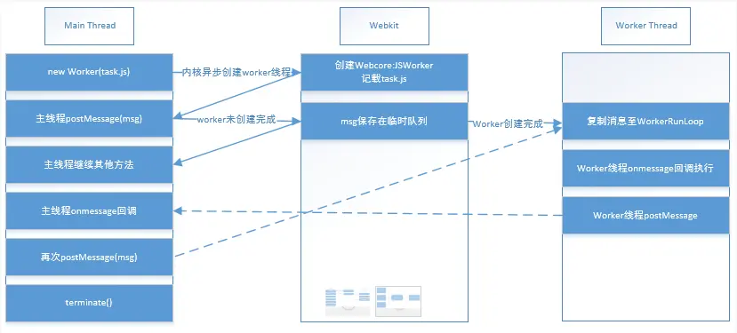代码执行到 var worker = new Worker(task.js') 时,在内核中构造 WebCore::JSWorker 对象(JSBbindings 层)以及对应的 WebCore::Worker 对象(WebCore 模块),根据初始化的 url 地址 task.js 发起异步加载的流程;主线程代码不会阻塞在这里等待 worker 线程去加载、执行指定的脚本文件,而是会立即向下继续执行后面代码。