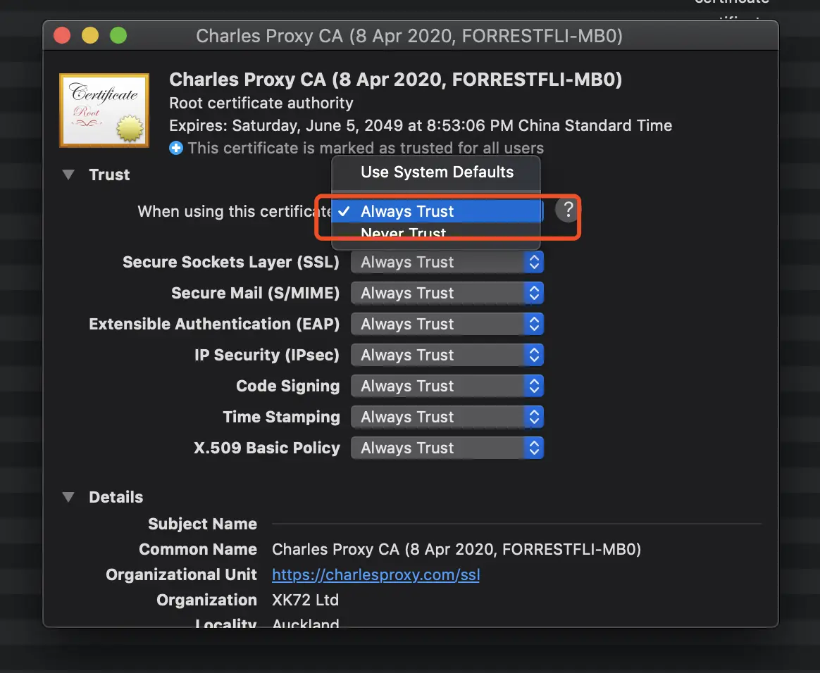 charles mac 电脑https抓包配置 forrestli104059 2020-04-08 915 阅读1分钟 前面写了android上小程序无法抓包的文章,今天重新配置了一下charles,发现还是有些细节很多文章没有描述全面,这里记录一下,方便查看 证书 解密站点配置 charles 默认不对https解密,只有配置的域名才替换证书显示明文 浏览器代理 配置好后记得保存和切换到对应代理 内外网设置