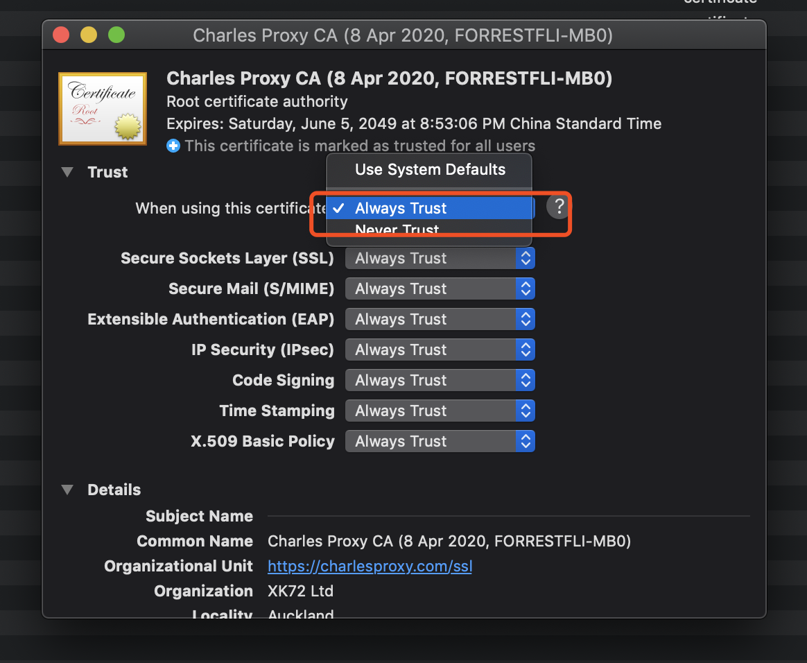 charles mac 电脑https抓包配置 forrestli104059 2020-04-08 937 阅读1分钟 前面写了android上小程序无法抓包的文章,今天重新配置了一下charles,发现还是有些细节很多文章没有描述全面,这里记录一下,方便查看 证书 解密站点配置 charles 默认不对https解密,只有配置的域名才替换证书显示明文 浏览器代理 配置好后记得保存和切换到对应代理 内外网设置