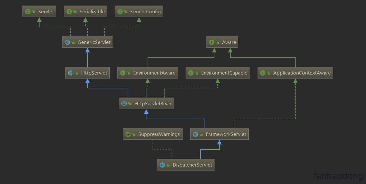 首先我们看蓝色部分 , 他继承自 FrameworkServlet , 然后FrameworkServlet继承了HttpServletBean,然后就到了我们常见的 HttpServlet和GenericServlet .