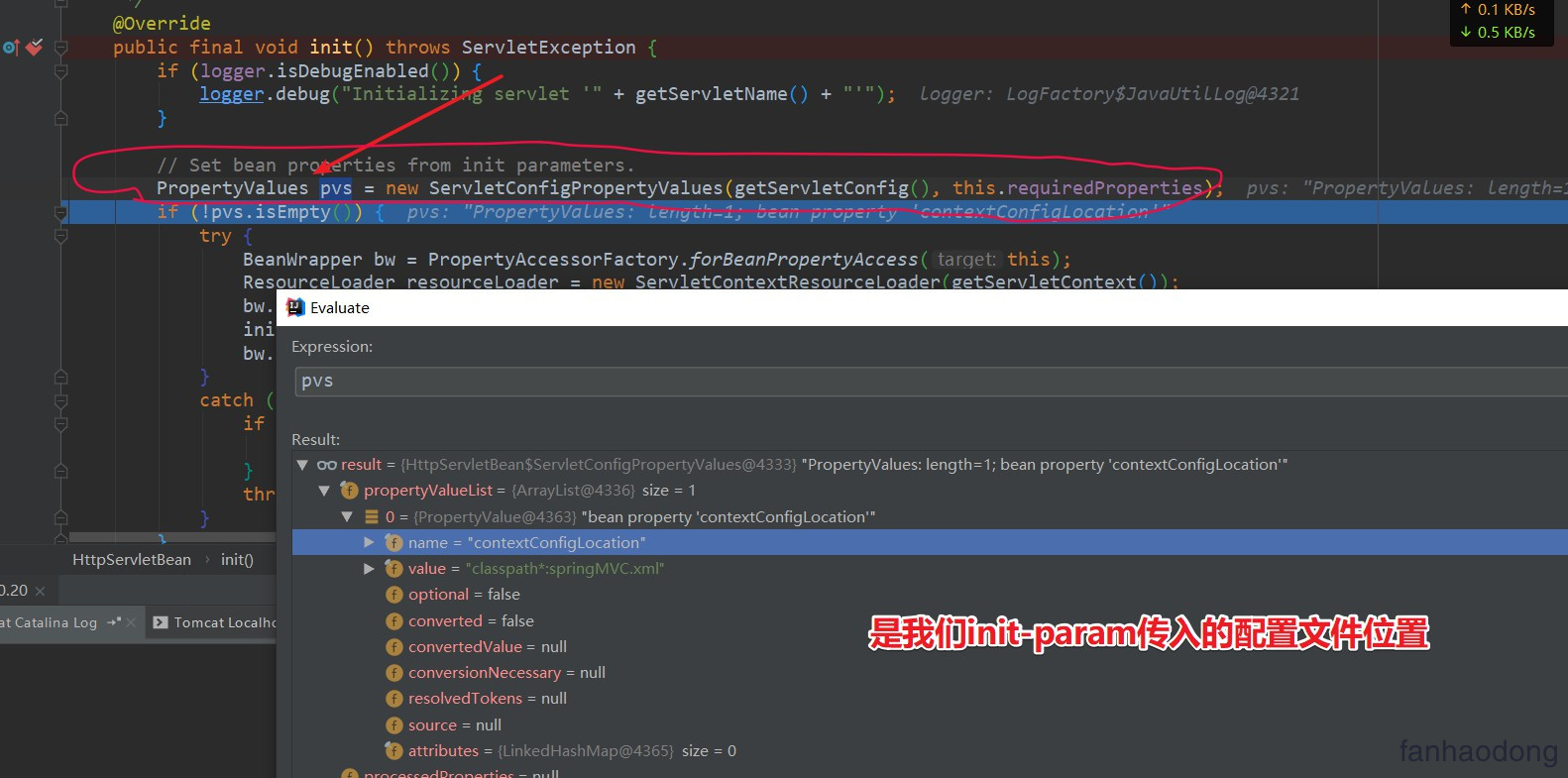首先由于 HttpServletBean重写了 init()方法 , 第一步就是获取我们<init-param>传入的配置信息 .