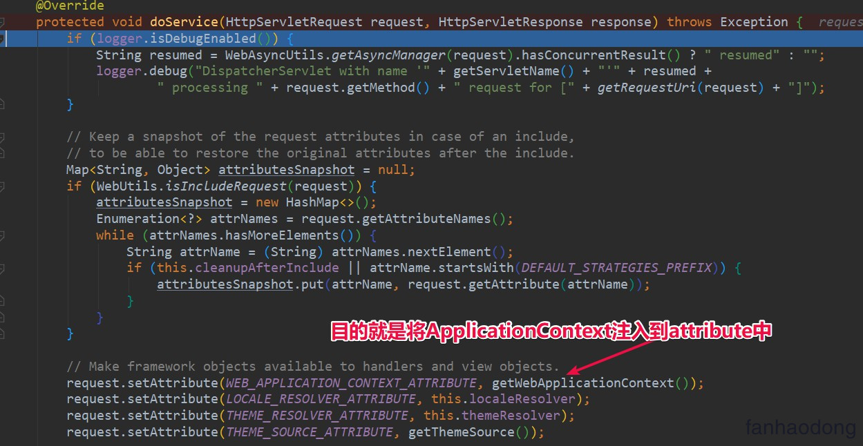 首先就是将我们的 ApplicationContext 注册到 request中 ,方便以后拿到