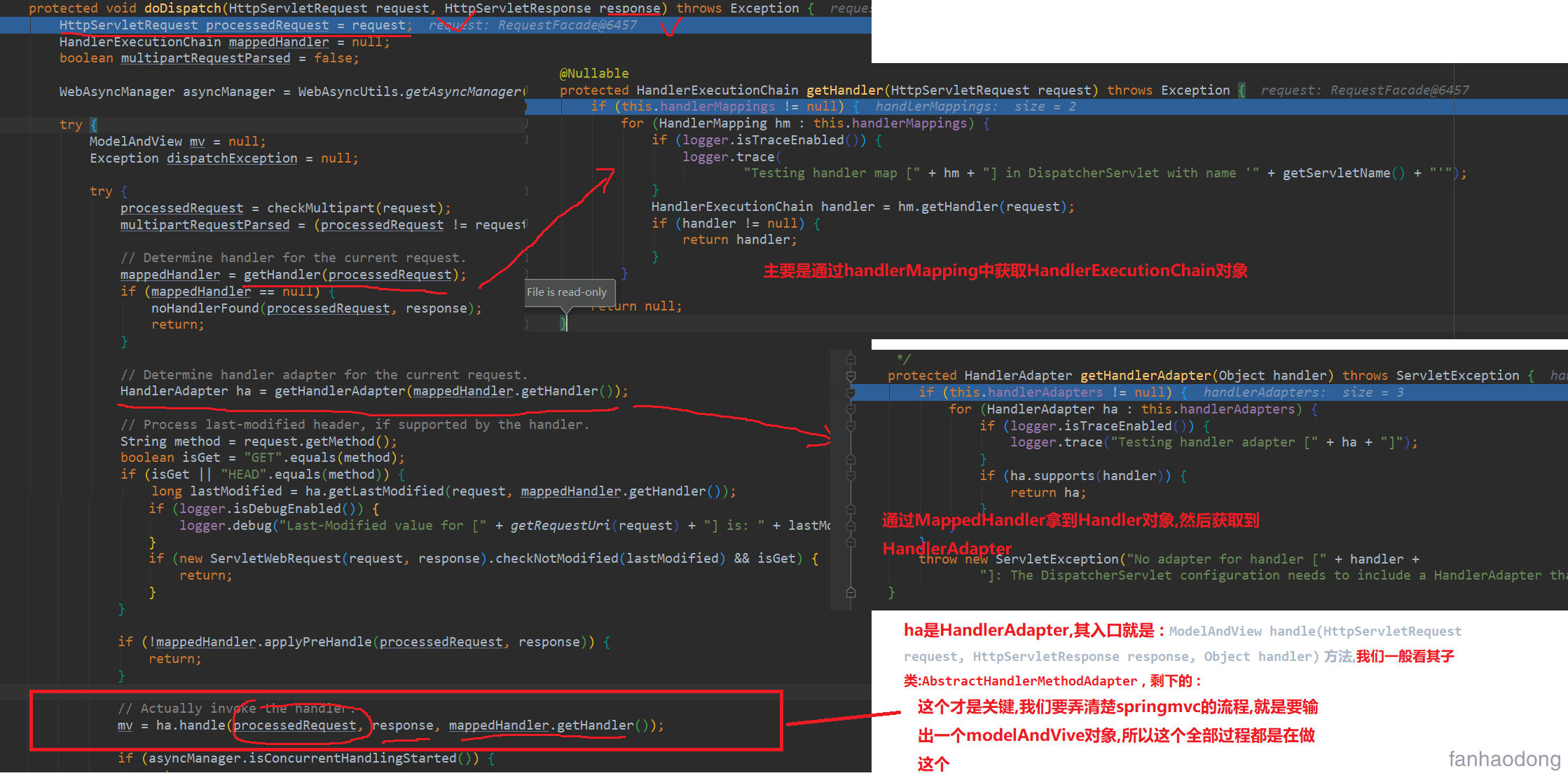 还有一个细节就是mappedHandler.applyPreHandle(processedRequest, response)这个方法的执行其实就是执行拦截器HandlerInterceptor, 如果拦截了直接就返回了, 没有拦截继续调用HandlerAdapter的handle()方法去做后续操作.....