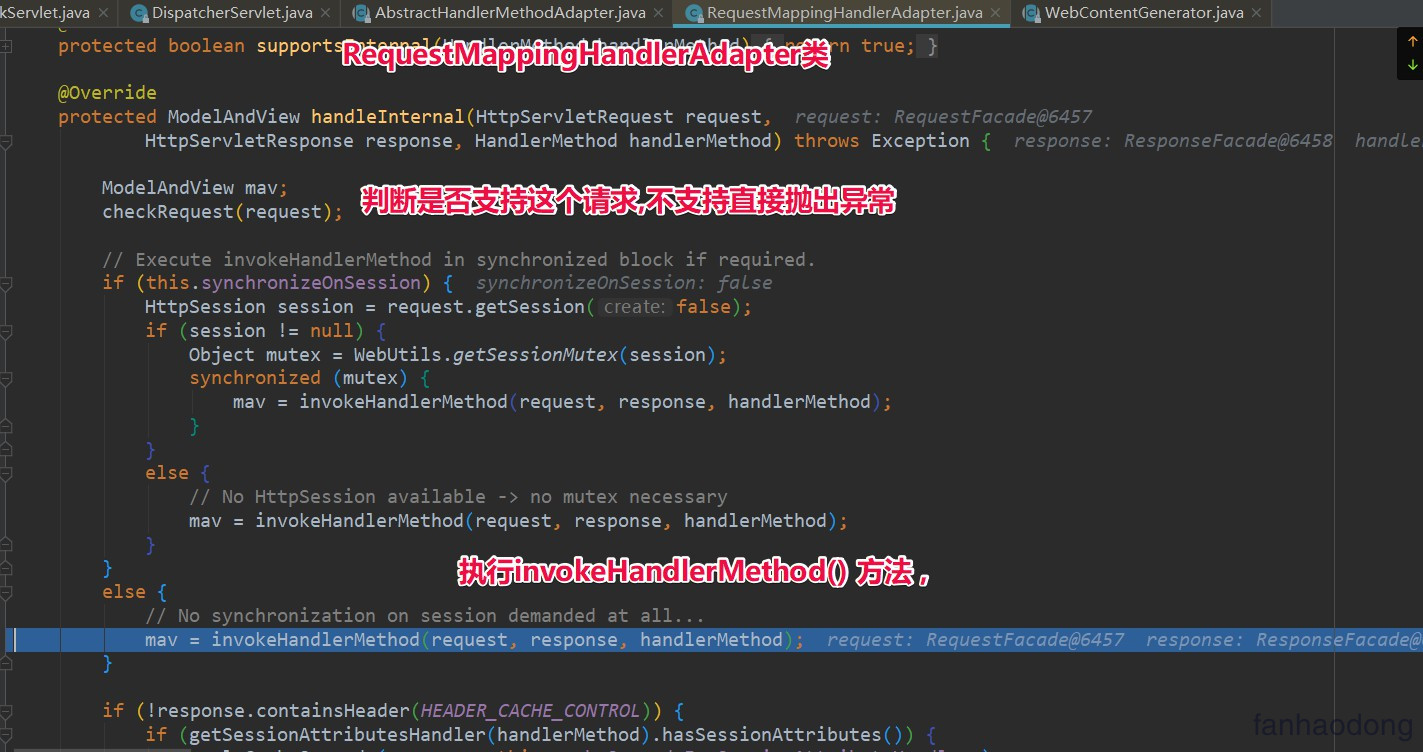 当我们拿到 HandlerMethod 对象 , 此时做的不是简单的调用 ,Method.invoke() 就完了 .... ,他使用了适配器模式 ,所以我们需要通过 HandlerMethod 对象找到他何时的适配器 HandlerAdapter ,然后适配器执行他的 handle 方法帮助我们返回 ModelAndVive .