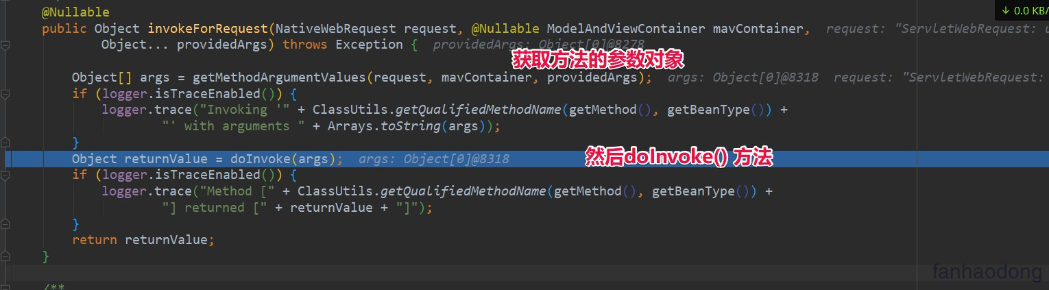 Object returnValue = invokeForRequest(webRequest, mavContainer, providedArgs); 方法执行 :