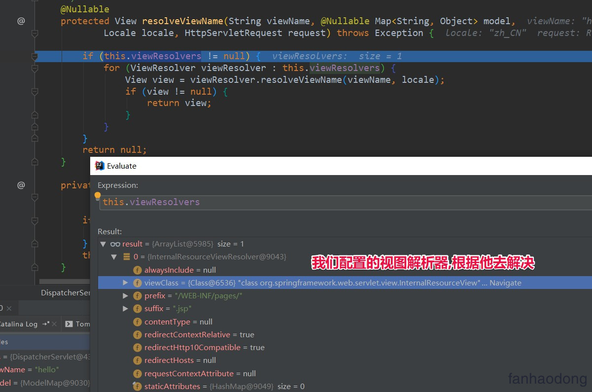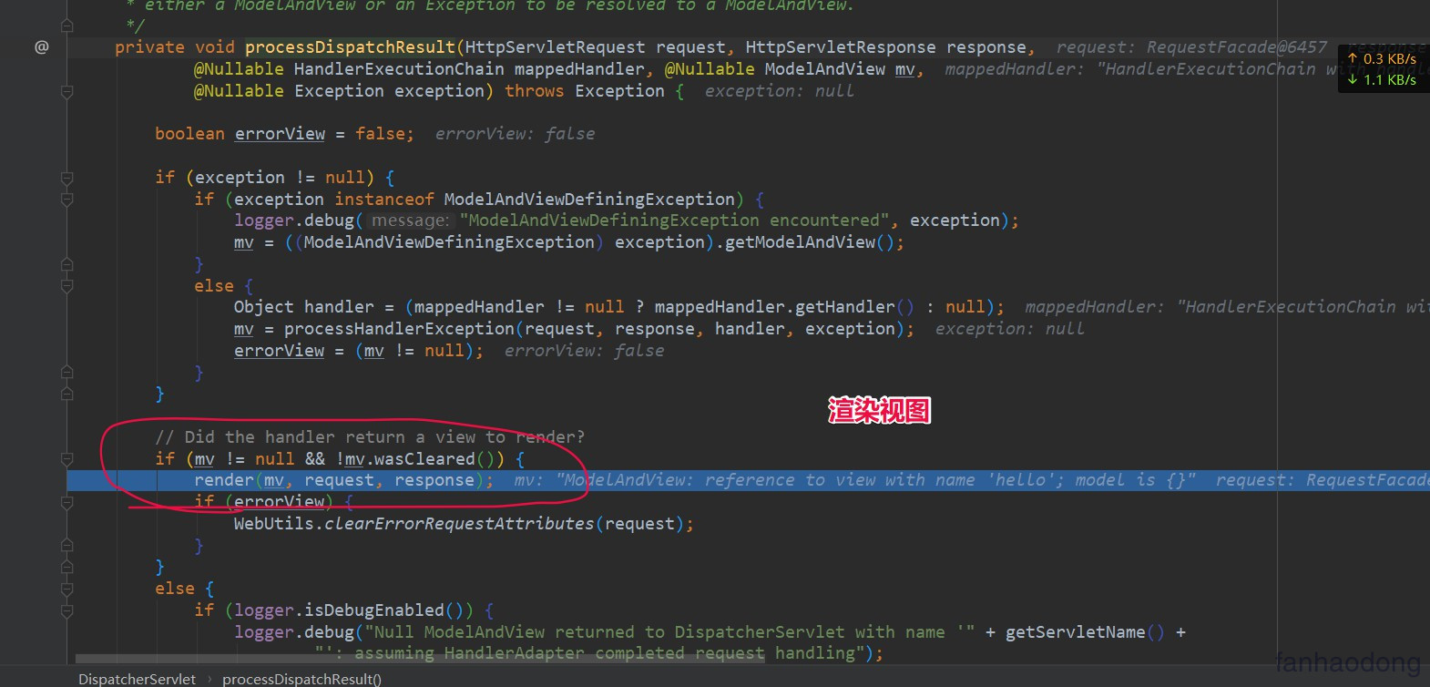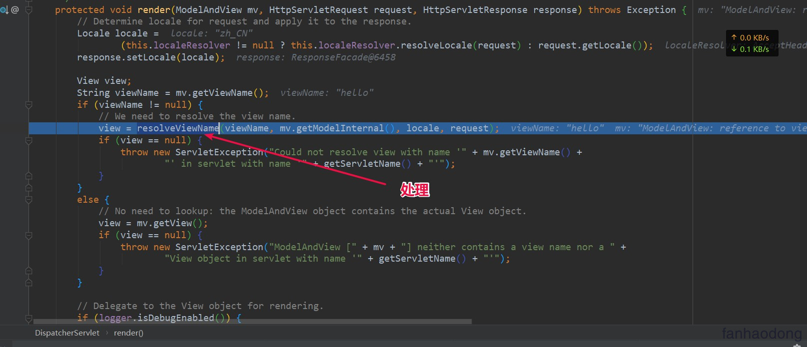 到了我们的 DispatcherServlet 的mv = ha.handle(processedRequest, response, mappedHandler.getHandler()); 这个方法执行完毕了 ............................... 然后开始渲染 ... ,执行的是 processDispatchResult(processedRequest, response, mappedHandler, mv, dispatchException);