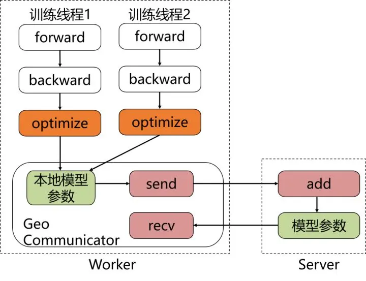 GEO异步训练:GEO是飞桨自研的异步训练模式,如图4所示,其最大的特点是将参数的更新从Server转移到Worker上。每个Worker在本地训练过程中会使用SGD优化算法更新本地模型参数,在训练若干个batch的数据后,Worker将发送参数更新信息给Server。Server在接收后会通过加和方式更新保存的参数信息。所以显而易见,在GEO异步训练模式下,Worker不用再等待Server发来新的参数即可执行训练,在训练效果和训练速度上有了极大的提升。但是此模式比较适合可以在单机内能完整保存的模型,在搜索、NLP等类型的业务上应用广泛,推荐在词向量、语义匹配等场景中使用。