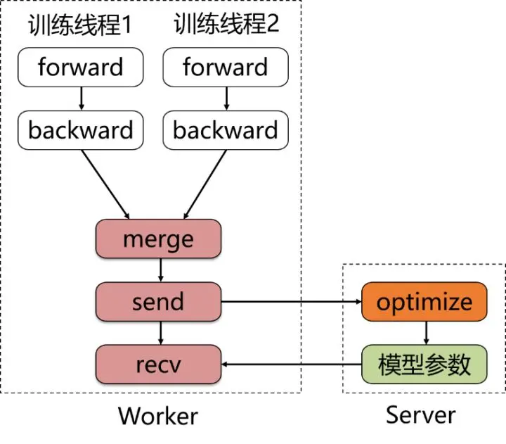 - 同步训练模式:如图2所示,Worker在训练一个batch的数据后,会合并所有线程的梯度发给Server, Server在收到所有节点的梯度后,会统一进行梯度合并及参数更新。同步训练的优势在于Loss可以比较稳定的下降,缺点是整个训练速度较慢,这是典型的木桶原理,速度的快慢取决于最慢的那个线程的训练计算时间,因此在训练较为复杂的模型时,即模型训练过程中神经网络训练耗时远大于节点间通信耗时的场景下,推荐使用同步训练模式。