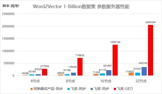 如图6所示,在词向量Word2Vector模型上,采用GEO训练模式的飞桨分布式训练的训练速度能够超越同类最优产品 18倍。