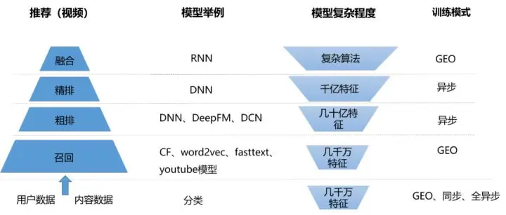 - 召回:根据用户信息从几百万视频候选中抽取几万条结果;此处模型训练的特点是特征量小、训练数据少、模型算法简单,因此比较适合GEO模式和同步模式。