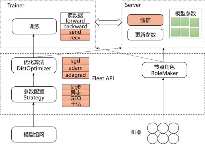 - 使用RoleMaker为参与训练的机器创建Worker和Server进程。RoleMaker有多种实现可适配用户的Kubernetes、MPI等环境。