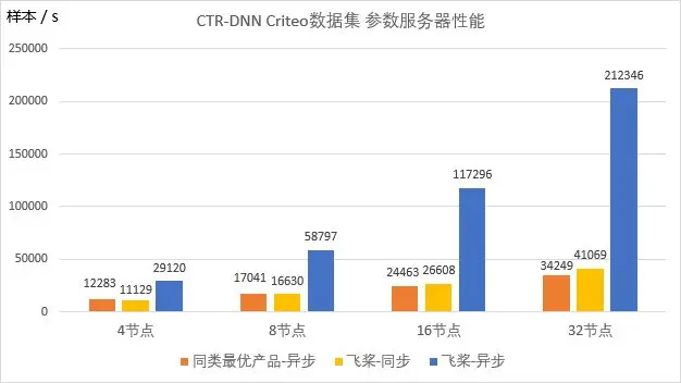 在训练效果相同的情况下,飞桨的参数服务器训练模式在训练速度上有很大优势。相比于业界同类最优产品,参数服务器训练模式在相同机器数量和硬件配置条件下能够大幅提升模型训练速度。