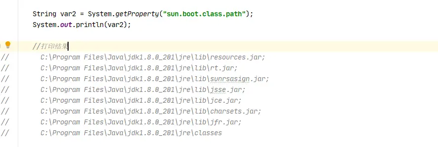 在 Java 层无法直接获取 BootstrapClassLoader 的引用,如果尝试获取则返回 null。BootstrapClassLoader 加载系统属性 sun.boot.classpath 配置下的字节码文件,我们可以通过打印: