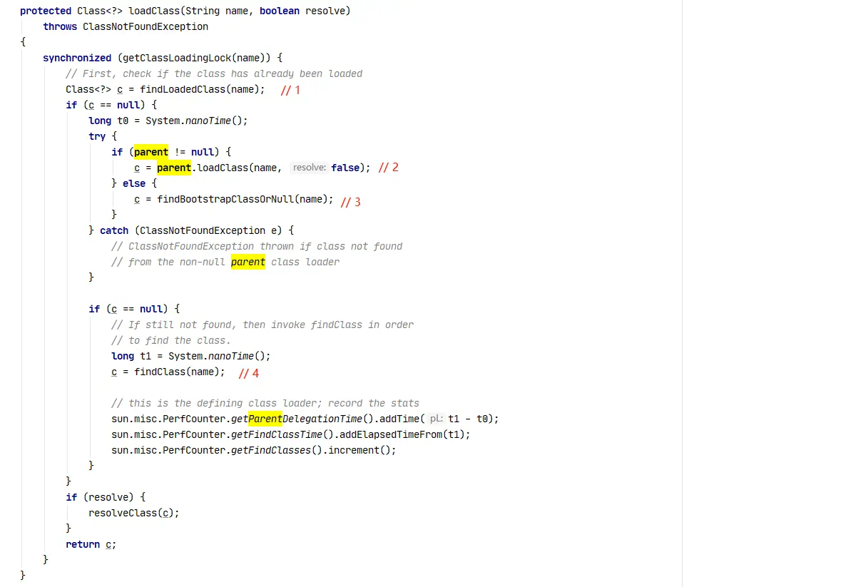 我们可以在 ClassLoader.java#loadClass(String, boolean) 找到双亲委派模式的影子,代码如下: