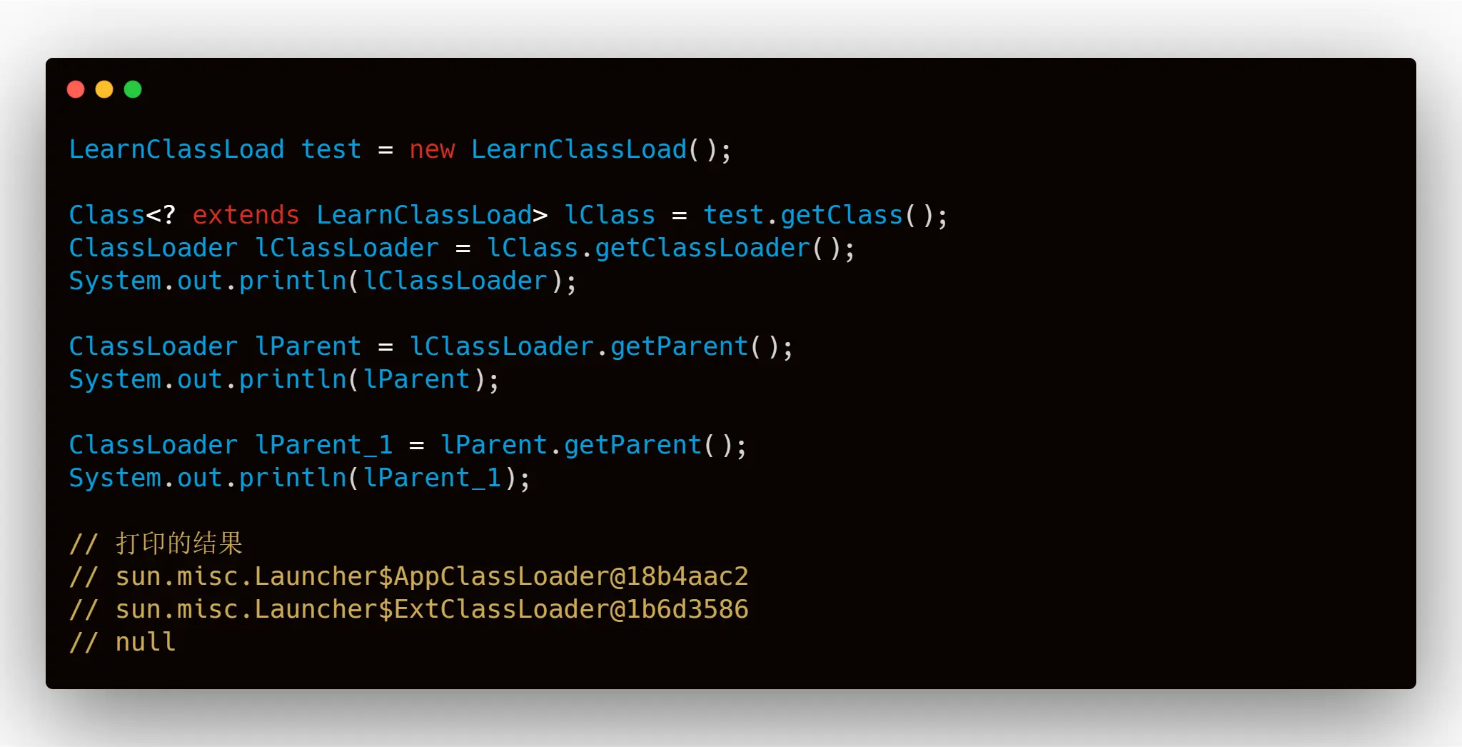最终 LearnClassLoad 是被 AppClassLoader 加载进虚拟机内存的,我们可以通过代码验证:
