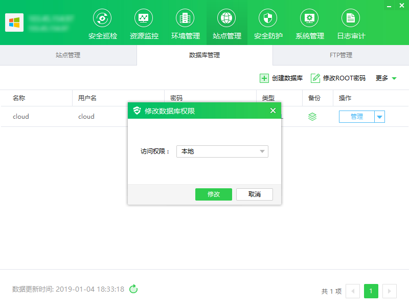 ① 点击“权限”,显示修改数据库权限弹框
