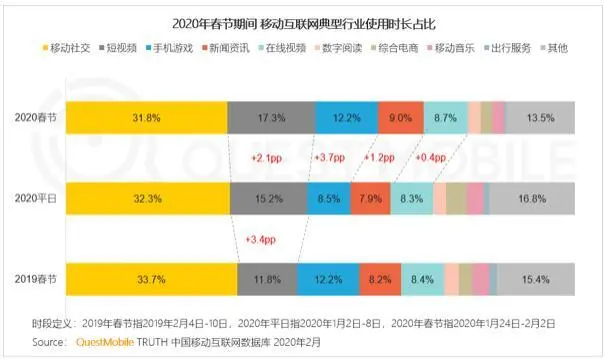 根据QuestMobile数据显示,相比去年春节,短视频的时长占比超过手机游戏,上涨至17.3%。
