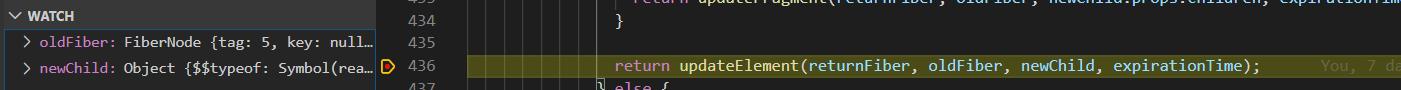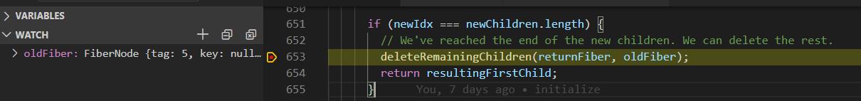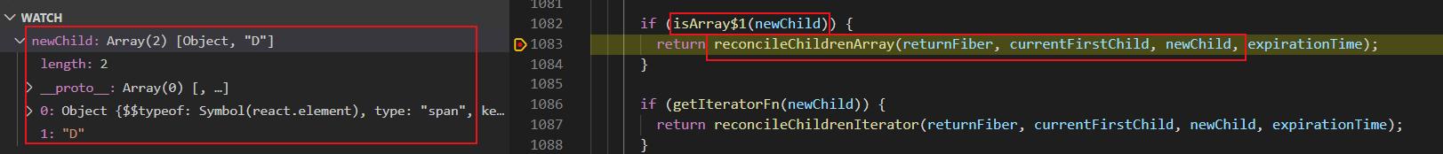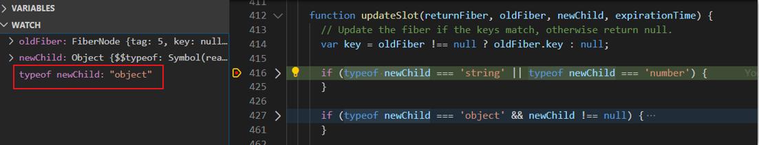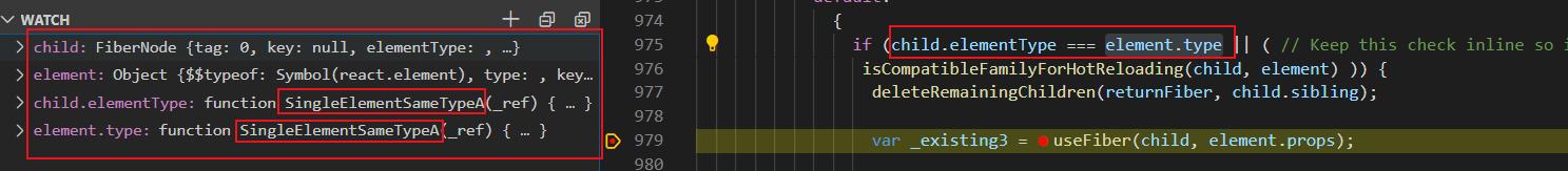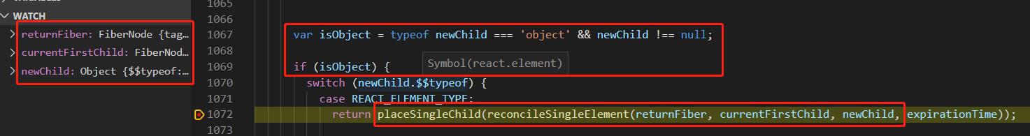 从第一步reconcileChildren(...)开始调试代码,无需关注与diff不相关的内容,比如renderExpirationTime。左侧调试面板可看到对应变量的类型。