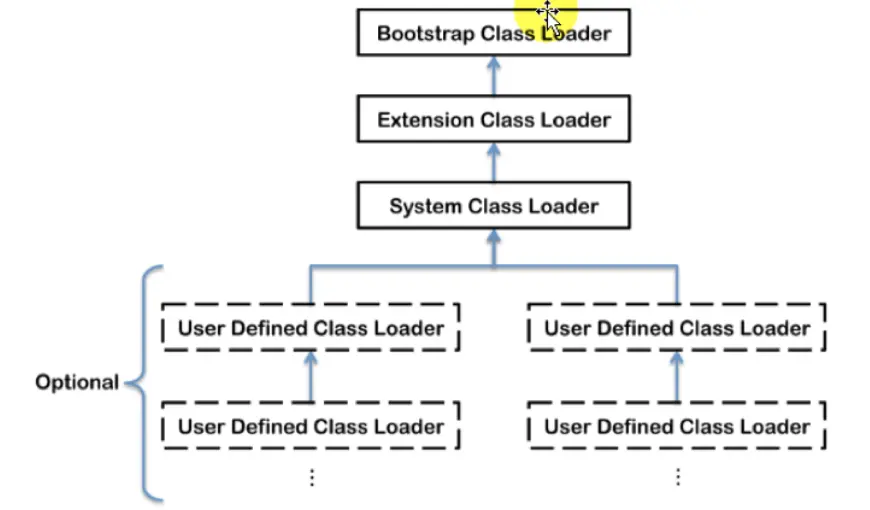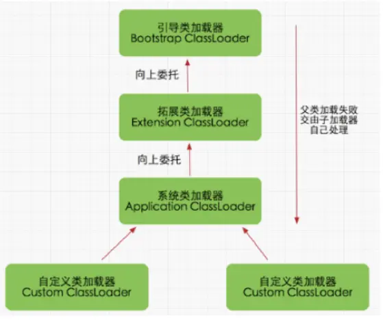 - 如果父类加载器还存在其父类加载器,则进一步向上委托,依次递归,请求最终将到达顶层的启动类加载器
