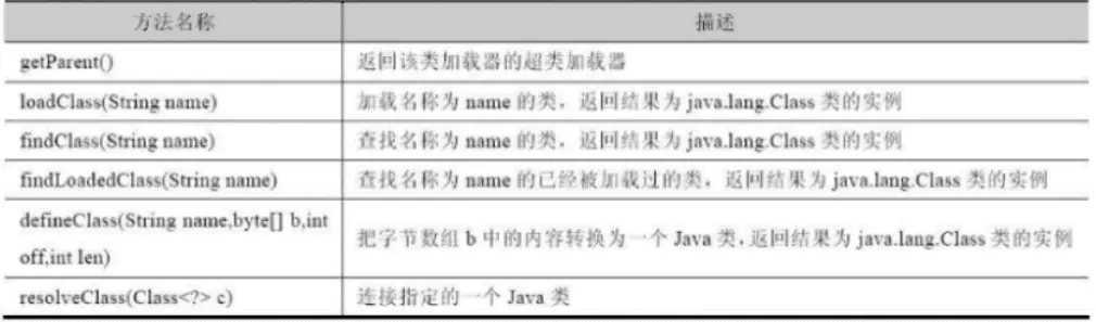 ClassLoader类,他是一个抽象类,其后所有的类加载器多继承自ClassLoader(不包含启动类加载器),常用方法如下: