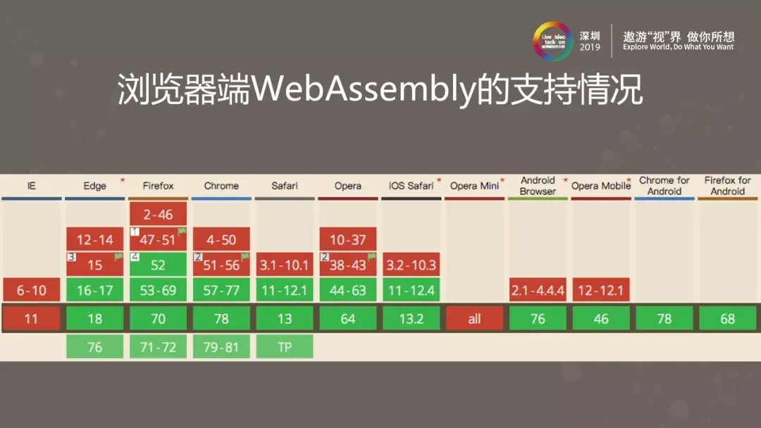 上图展现了浏览器端WebAssembly的支持情况,尽管个别低版本的浏览器有一些支持限制,但随着标准化委员会对该标准的不断推进,情况会变得越来越好。在包括一些混合式场景,例如APP内嵌(比如聊天工具或通讯工具当中打开一个链接)等情况,是否支持也取决于WebView本身提供的能力以及WebAssembly的支持情况,总体上来说趋于向好。