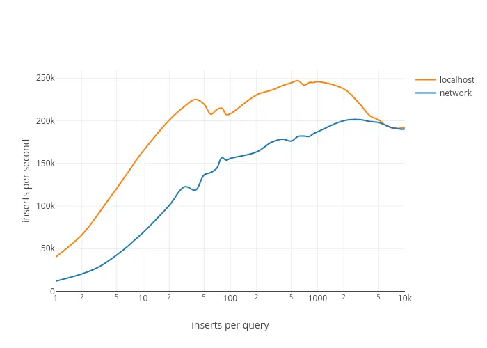 这两种情况都需要每个查询大约 1,000 个插入来达到最大吞吐量。但是每条查询 40 个插入就足以在本地主机上达到 90% 的吞吐量,这可能是一个很好的折衷。还需要注意的是,达到峰值之后,随着每个查询插入数量的增加,性能实际上是会下降。