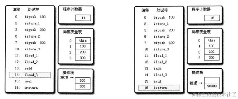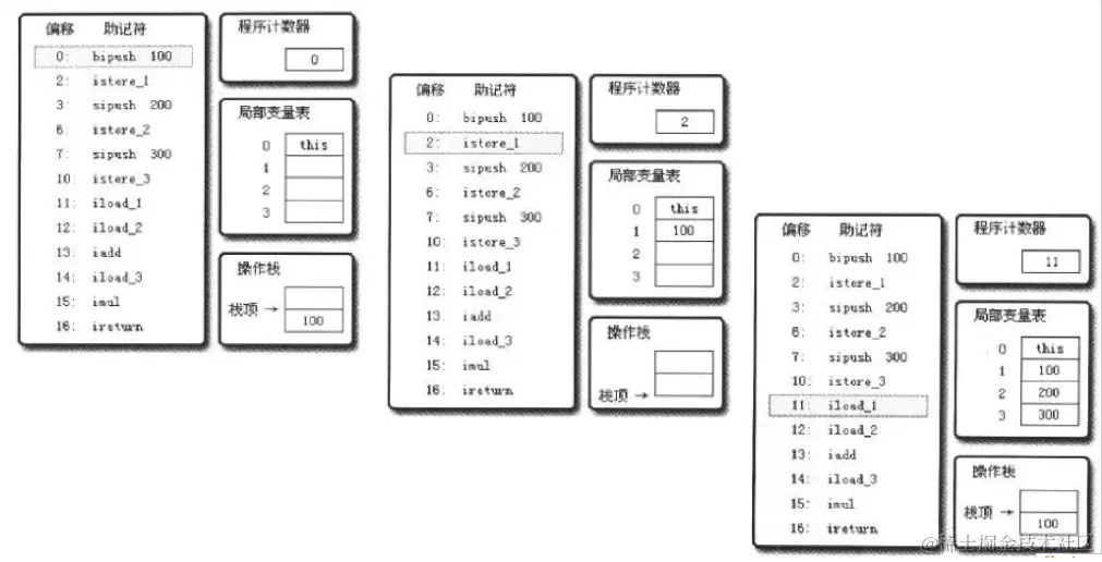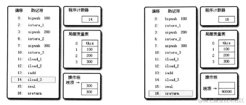 mov eax,2 //将eax寄存器的值设为2 add eax,3 //将eax寄存器的值加3 - 基于栈式的计算流程(以Java虚拟机为例):