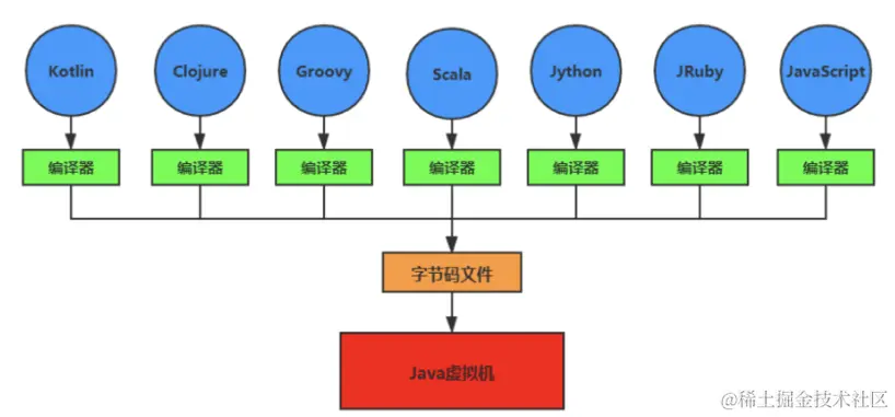 - 随着Java7的正式发布,Java虚拟机的设计者们通过JSR-292规范基本实现在Java虚拟机上运行非Java语言编写的程序;