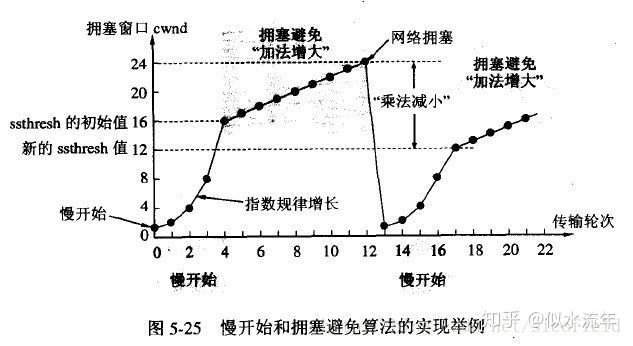 从上图可以看到,一个传输轮次所经历的时间其实就是往返时间RTT,而且没经过一个传输轮次(transmission round),拥塞窗口cwnd就加倍。 为了防止cwnd增长过大引起网络拥塞,还需设置一个慢开始门限ssthresh状态变量。ssthresh的用法如下:当cwnd<ssthresh时,使用慢开始算法。 当cwnd>ssthresh时,改用拥塞避免算法。 当cwnd=ssthresh时,慢开始与拥塞避免算法任意 注意,这里的“慢”并不是指cwnd的增长速率慢,而是指在TCP开始发送报文段时先设置cwnd=1,然后逐渐增大,这当然比按照大的cwnd一下子把许多报文段突然注入到网络中要“慢得多”。 (二)拥塞避免算法: 拥塞避免算法让拥塞窗口缓慢增长,即每经过一个往返时间RTT就把发送方的拥塞窗口cwnd加1,而不是加倍。这样拥塞窗口按线性规律缓慢增长。 无论是在慢开始阶段还是在拥塞避免阶段,只要发送方判断网络出现拥塞(其根据就是没有按时收到确认,虽然没有收到确认可能是其他原因的分组丢失,但是因为无法判定,所以都当做拥塞来处理),就把慢开始门限ssthresh设置为出现拥塞时的发送窗口大小的一半(但不能小于2)。然后把拥塞窗口cwnd重新设置为1,执行慢开始算法。这样做的目的就是要迅速减少主机发送到网络中的分组数,使得发生拥塞的路由器有足够时间把队列中积压的分组处理完毕。 整个拥塞控制的流程如下图: