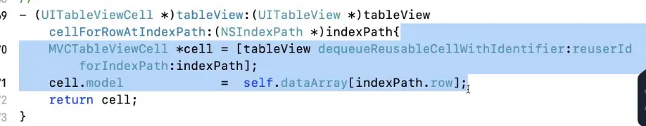 self.dataSource = [[LMDataSource alloc] initWithIdentifier:reuserId configureBlock:^(MVCTableViewCell *cell, Model *model, NSIndexPath *indexPath) {