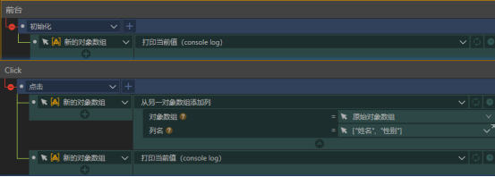 3.最后我们可以在前台初始化时和点击按钮添加列后都打印一下新的对象数组的值看一下结果。前台初始化时新的对象数组是空的,点击按钮后原始对象数组的姓名列和性别列则已经添加到新的对象数组中了。